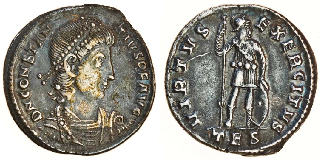 Constantius II (AD 337-361), AR Miliarense, 4.56g, Thessalonica, 355-361, pearl-diademed, draped and cuirassed bust right, d n constan-tivs p f avg, rev. virtvs exercitvs, soldier standing right, holding spear and leaning left hand on shield beside him, tes in exergue (RIC 203; RSC 326†j), almost extremely fine, rare