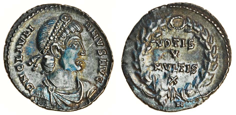 Julian II (AD 360-363), AR Siliqua, 2.31g, Trier, 364-367, pearl-diademed, draped and cuirassed bust right, d n cl ivli-anvs avg, rev. votis / v /mvltis / x in wreath, tr in exergue (RIC 364; RSC 157a), iridescent toning, extremely fine