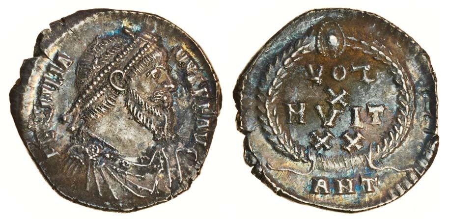 Julian II (AD 360-363), AR Siliqua, Antioch, 2.25g, pearl-diademed, draped and cuirassed bearded bust right, fl cl ivlia-nvs pf avg, rev. vot / x / mvlt / xx in wreath, ant in exergue (RIC 213; RSC 147†a), extremely fine