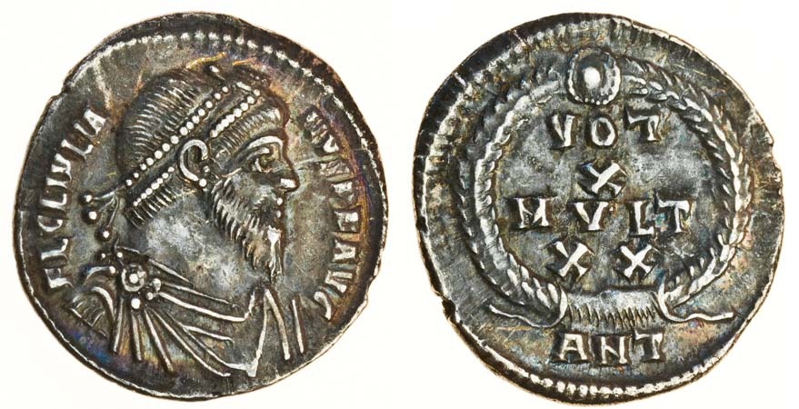 Julian II (AD 360-363), AR Siliqua, Antioch, 2.18g, pearl-diademed, draped and cuirassed bearded bust right, fl cl ivlia-nvs p f avg, rev. vot / x / mvlt / xx in wreath, ant in exergue (RIC 213; RSC 147†a), about extremely fine