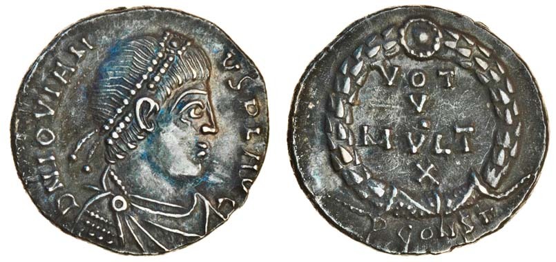 Jovian (AD 363-364) AR Siliqua, 2.00g, Arles, pearl-diademed, draped and cuirassed bust right, d n iovian-vs p f avg, rev. vot / v / mvlt / x in wreath, pconst in exergue (RIC 332; RSC 33Ab), despite Jovian only ruling for about a year, he proclaims thanks for 5 years of rule, extremely fine, rare