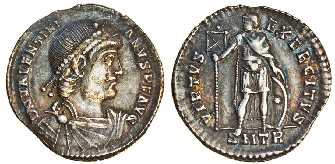 Valentinian I (AD 364-375), AR Miliarense, 4.42g, Trier, 367-375. pearl-diademed, draped and cuirassed bust right, d n valentine-anvs p f avg, rev. virtvs exercitvs, emperor standing left, holding standard and resting left hand on shield at his side, smtr in exergue (RIC 26a; RSC 58a; Num. Chron 1888, p. 22, 1= this coin), good very fine, rare