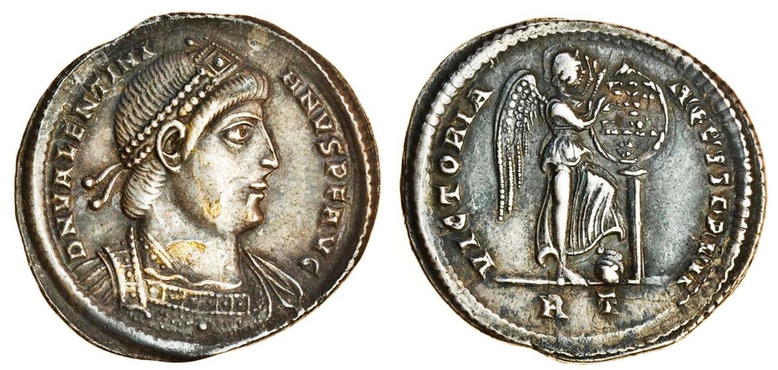 Valentinian I (AD 364-375), AR Miliarense, 4.25g, Rome, 364-367, pearl-diademed, draped and cuirassed bust right, d n valentini-anvs p f avg, rev. victoria avgvstorvm, Victory standing right, left foot on globe, inscribing vot / v mvlt / x on shield set on cippus, rt in exergue (RIC 8a; RSC 51b; Num. Chron p. 23, 2, pl. ii, 12 = this coin), light double-striking on shield, almost extremely fine, reverse good very fine, rare