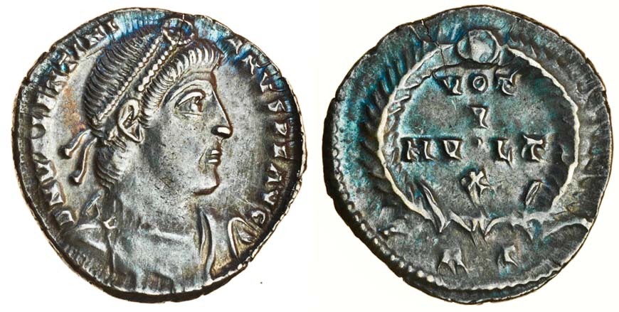 Valentinian I (AD 364-375), AR Siliqua, 2.04g, Rome, 364-367, pearl-diademed, draped and cuirassed bust right, d n valentini-anvs p f avg, rev. vot / v / mv·lt / x in wreath, rt in exergue (RIC 10a(3); RSC 70†f), extremely fine