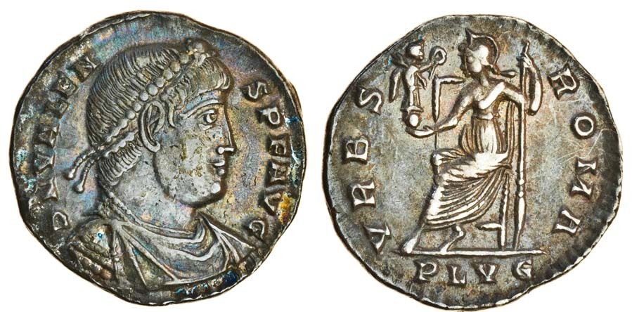 Valens (AD 364-378), AR Siliqua, 2.32g, Lugdunum, 364-367, pearl-diademed, draped and cuirassed bust right, d n valen-s p f avg, rev. vrbs roma, Roma seated left on throne, holding Victory on globe, and spear, plvg in exergue (RIC 9b; RSC 109†d), the only one of its type from Lugdunum in the hoard, about extremely fine