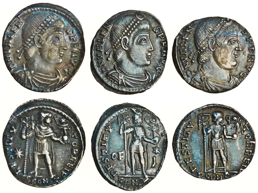 Valens (AD 364-378), AR Siliqua, 2.16g, Arles, 364-367, pearl-diademed, draped and cuirassed bust right, d n valen-s p f avg, rev. restitv-tor reip, emperor standing facing, head right, holding labarum (with chi-rho on banner) and Victory on globe, star in left field, sconst in exergue (RIC 6d(3); RSC 28†e), another similar, 2.08g, but no star, and pconst (RIC 6d (1); RSC 28†d), and another similar, 2.34g, but of - i and star in field and const in exergue (RIC 6d (8); RSC 28†h), very fine to about extremely fine (3)