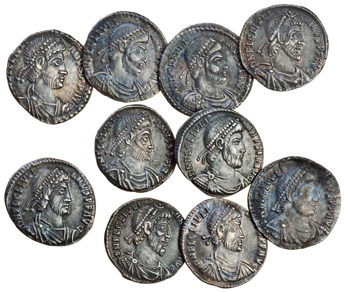 Julian II (AD 360-363), AR Siliqua (10), Arles, pearl-diademed, draped and cuirassed bearded bust right, dn fl cl ivli-anvs p f avg, rev. vot / x / mvlt / xx in wreath with medallion containing eagle or pellet, pconst, sconst or tconst in exergue (RIC 309 and 312; RSC 148c), very fine to good very fine (10)