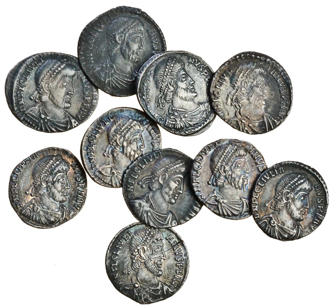 Julian II (AD 360-363), AR Siliqua (10), Arles, pearl-diademed, draped and cuirassed bearded bust right, dn fl cl ivli-anvs p f avg, rev. vot / x / mvlt / xx in wreath with medallion containing eagle or pellet, pconst, sconst or tconst in exergue (RIC 309 and 312; RSC 148c), very fine (10)