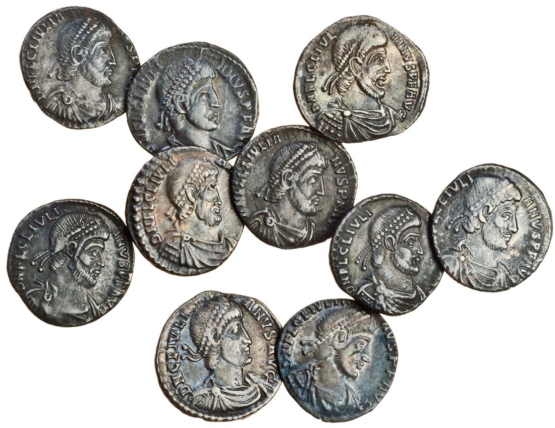 Julian II (AD 360-363), AR Siliqua (10), Arles, pearl-diademed, draped and cuirassed bearded bust right, dn fl cl ivli-anvs p f avg, rev. vot / x / mvlt / xx in wreath with medallion containing eagle or pellet, pconst, sconst or tconst in exergue (RIC 309 and 312; RSC 148c), very fine (10)