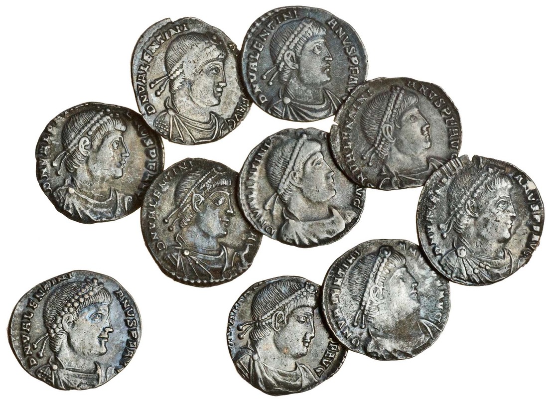 Valentinian I (AD 364-375), AR Siliqua (10), Lugdunum, 364-367, pearl-diademed, draped and cuirassed bust right, d n valentini-anvs p f avg, rev. restitv-tor reip, emperor standing facing, head right, holding labarum (with chi-rho on banner, shaft with X, hook or plain), and Victory on globe, plvg or slvg in exergue (RIC 6a-c; RSC 18-19†b-d), almost very fine to very fine (10)
