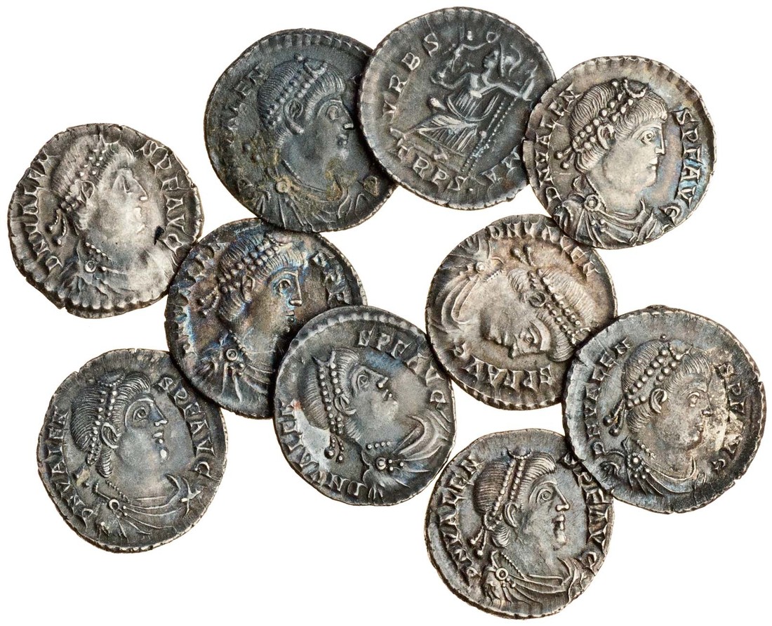Valens (AD 364-378), AR Siliqua (10), Trier, 375-378, pearl-diademed, draped and cuirassed bust right, d n valen-s p f avg, rev. vrbs roma, Roma seated left on throne, holding Victory on globe, and spear, trp or trps· in exergue (RIC 27e; RSC 109†b), extremely fine (10)