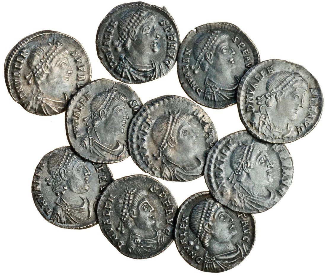 Valens (AD 364-378), AR Siliqua (10), Trier, 375-378, pearl-diademed, draped and cuirassed bust right, d n valen-s p f avg, rev. vrbs roma, Roma seated left on throne, holding Victory on globe, and spear, trp or trps· in exergue (RIC 27e; RSC 109†b), extremely fine (10)