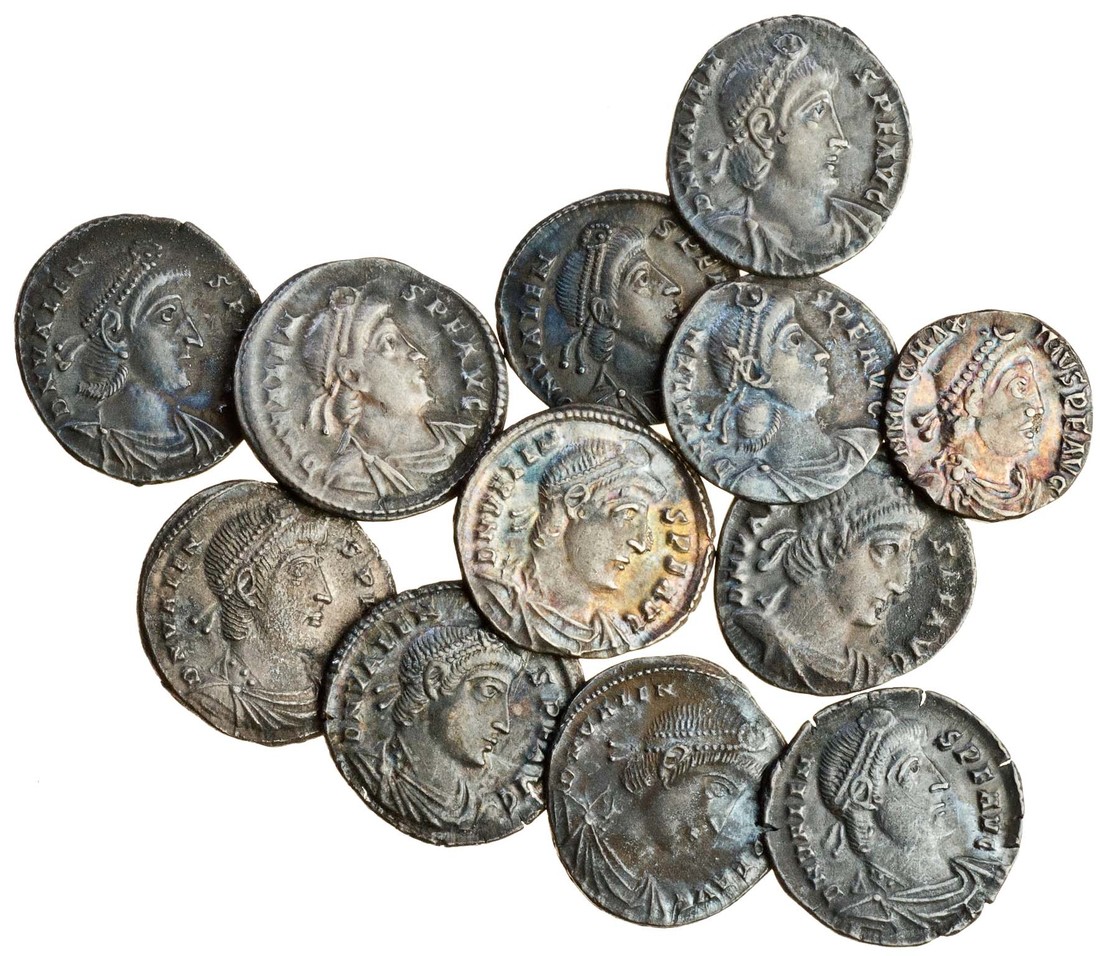 Valens (AD 364-378), AR Siliqua (12), Rome, 364-367, pearl-diademed, draped and cuirassed bust right, d n valen-s p f avg, rev. vot / v / mv·lt / x in wreath, rb or rt in exergue (RIC 10c; cf. RSC 91†d), and Magnus Maximus (AD 383-388), AR Siliqua, Trier, similar bust, rev. virtvs romanorvm, Roma seated facing, trps in eergue (RIC 84b; RSC 20a), very fine or better (12)