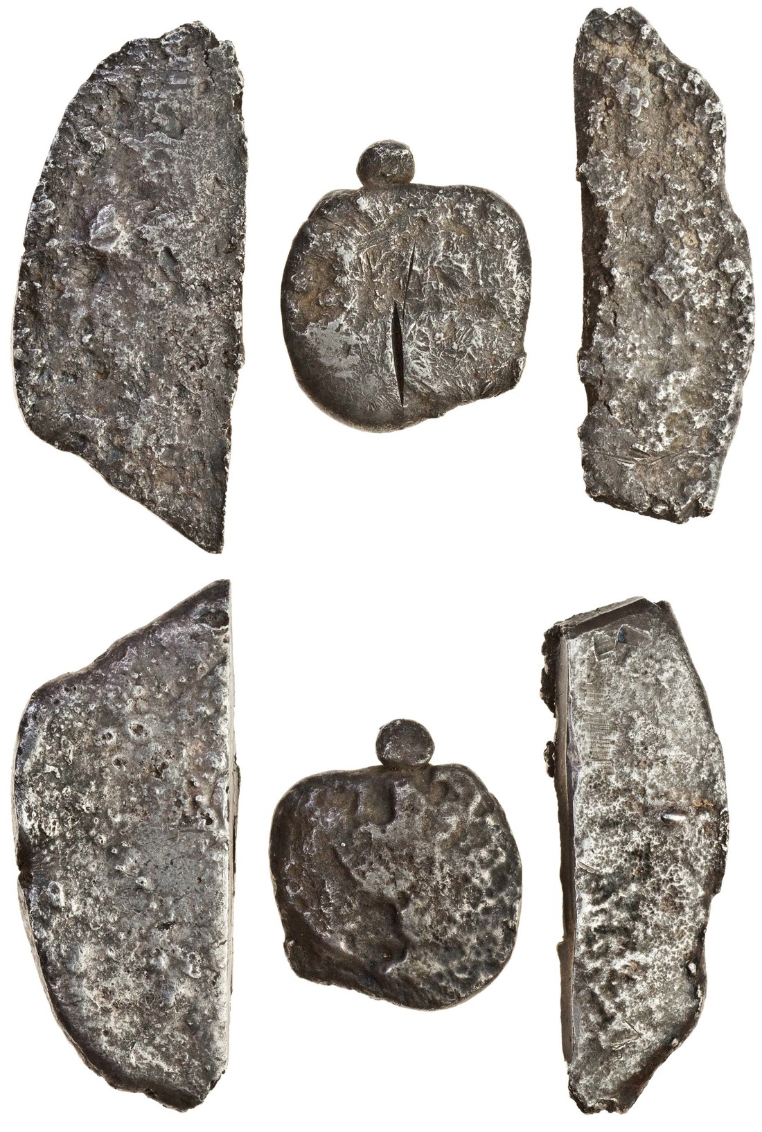 Silver ingots (3), two chopped segments weighing 52.38g and 41.77g, and another in lenticular form weighing 33.53.