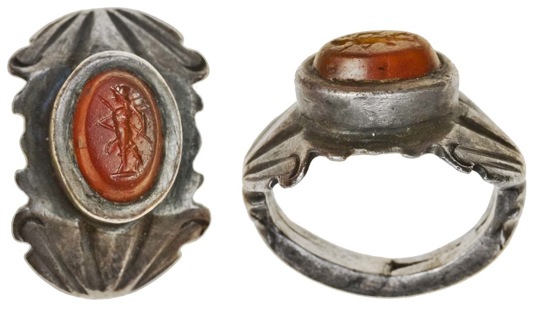 Roman Silver ring, 18.55g., with its centrepiece a carnelian engraved with a figure of Mars striding left, holding a trophy over his shoulder and a spear. The opening for the finger is a flattened oval shape - typical of Roman rings, and the carnelian protrudes several millimetres clear of its mount