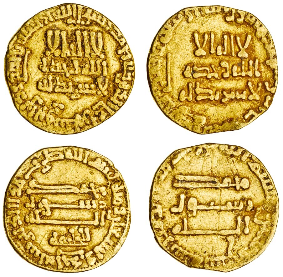 Abbasid, temp. al-Rashid (786-809), AV Dinar, 4.09g, mintless type (Misr), AH191, with li'l-khalifa below reverse (Bernardi 73; A.218.13), about very fine; temp. al-Ma'mun (810-833) AV Dinar, 3.79g, mintless type, AH209 (unclear) (Bernardi 51; A.222.14), possibly a contemporary copy, fine (2)