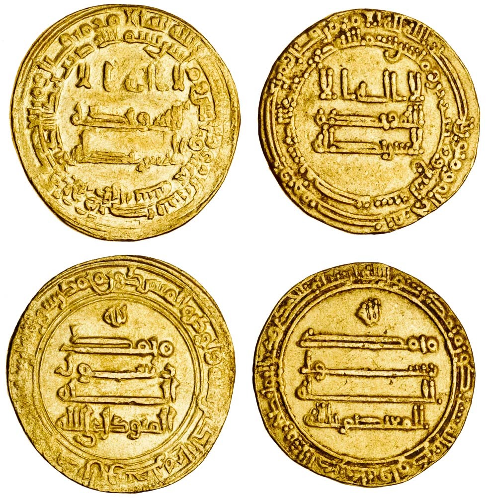 Abbasid, al-Mu'tasim (833-42), AV Dinar, 3.91g, Misr, AH224 (Bernardi 151De; A.225), very fine; al-Mutawakkil (847-86), AV Dinar, 4.27g, Misr, date unclear, probably AH235 (Bernardi 1551De; A.229.1), obverse double struck, good very fine (2)