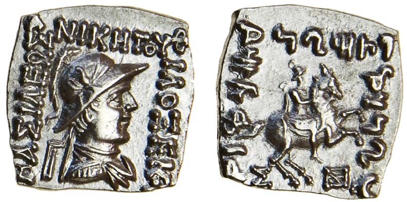 Indo-Greek Kingdom of Baktria, Philoxenus (100-95 BC), square Drachm, 2.39g, helmeted bust of Philoxenus right, baie anikhtoy Φioenoy, rev. king on horseback right, Kharoshthi legend around, monogram below (M.341e; SNG.1189-92; Bop.Ser.6), good extremely fine, scarce