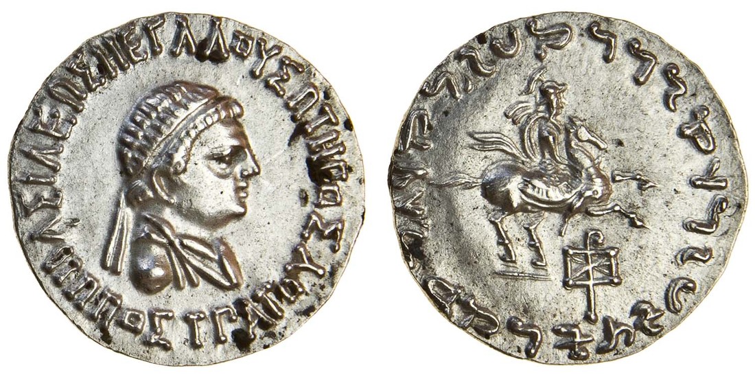 Indo-Greek Kingdom of Baktria, Hippostratos (c.65-55 BC), Tetradrachm, 9.78g, diademed bust of Hippostratos right, baie meaoy thpo iotpatoy, rev. king on horseback right, Kharoshthi legend around, monogram below (M.443a; cf. SNG.1622 (legend varies); Bop.Ser.5.5), small patches of dirt between letters, extremely fine, scarce