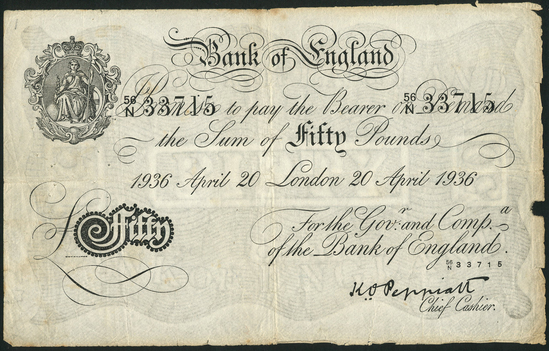 Bank of England, K O Peppiatt, Operation Bernhard £50, 20 April 1936, serial number 56N 33715, black and white, bank title top centre, seated Britannia top left, value at centre and low left