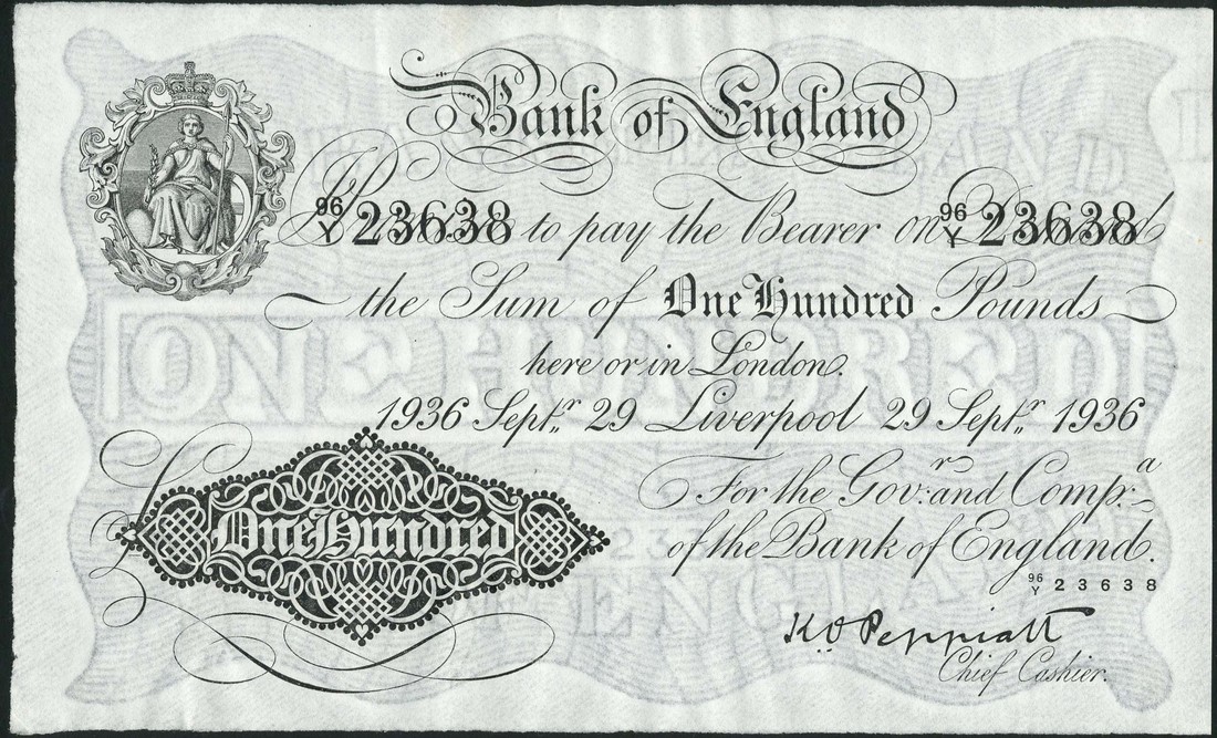 Bank of England, K.O. Peppiatt, £100, Liverpool, 29 September 1936, serial number 96/Y 23638, black and white, ornate crowned vignette of Britannia top left, value in black tablet low left