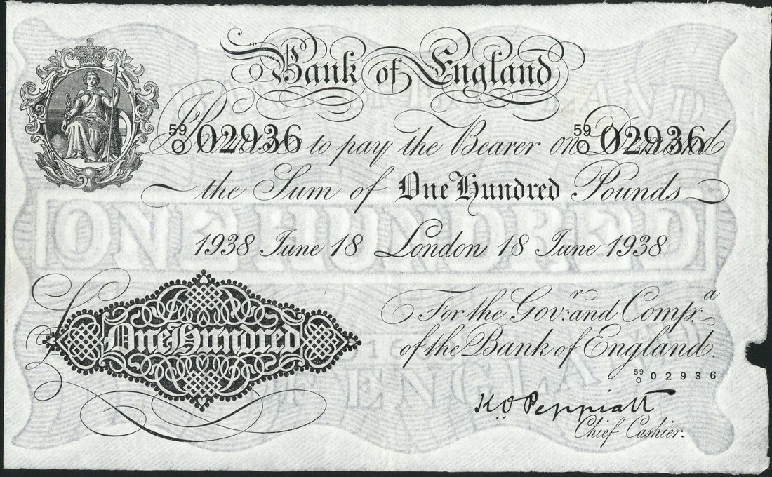 Bank of England, K.O. Peppiatt, £100, London, 18 June 1938, serial number 59/O 02936, black and white, ornate crowned vignette of Britannia top left, value in black tablet low left