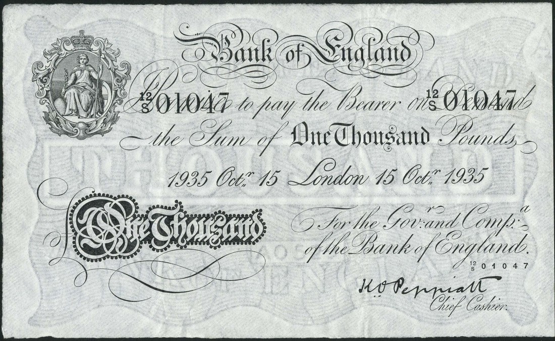 Bank of England, K.O. Peppiatt, £1000, London, 15 October 1935, serial number 12/S 01047, black and white, ornate crowned vignette of Britannia top left, value in black tablet low left