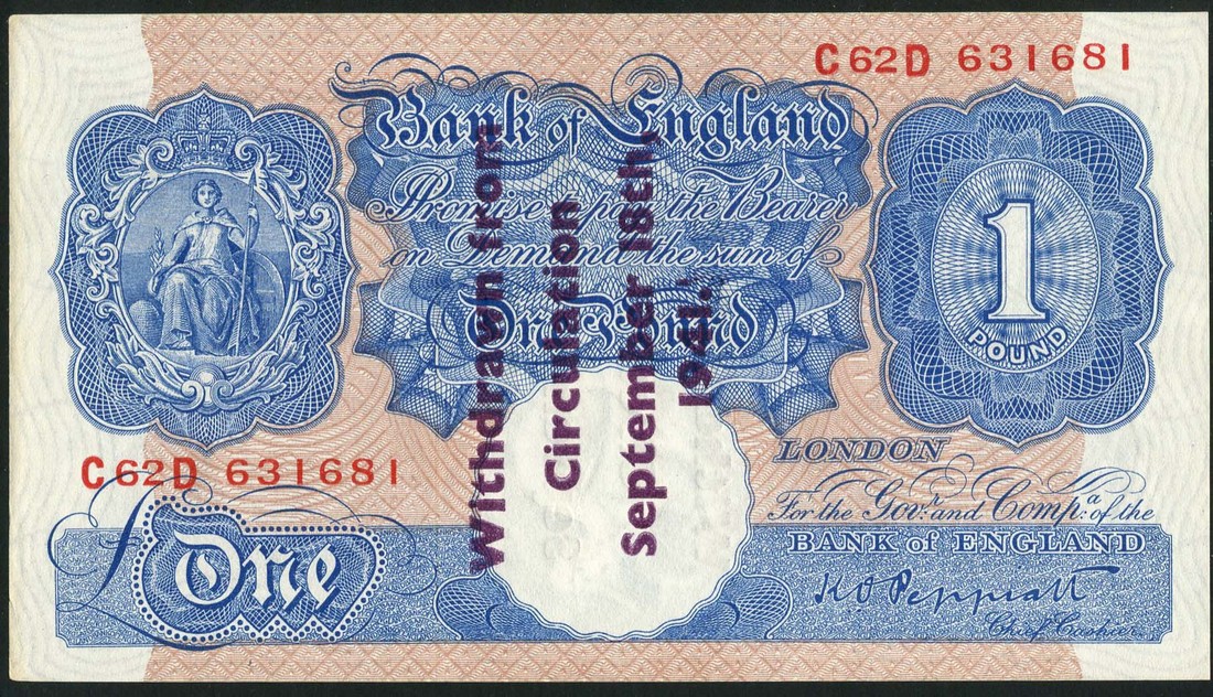 States of Guernsey overprints, K O Peppiatt, £1, 1941, serial number C62D 631681, blue and pink-brown, Britannia at left, value at right, purple overprint 'Withdrawn from circulation September 18th 1941.' at centre