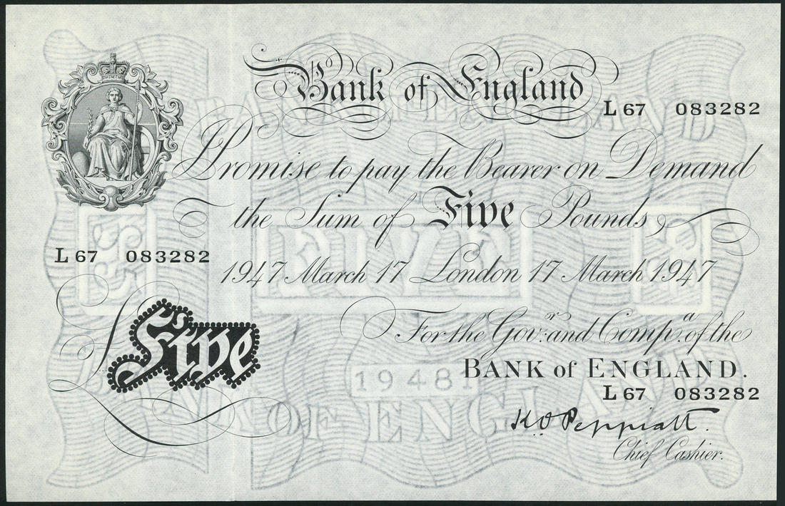 Bank of England, K.O.Peppiatt, £5(2), 17 March 1947, serial number L67 083282/296, black and white, ornate crowned vignette of Britannia top left, value in black tablet low left