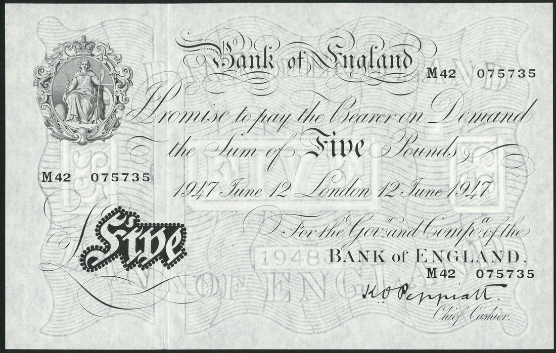 Bank of England, K.O.Peppiatt, £5, London, 12 June 1947, serial number M42 075735, black and white, ornate crowned vignette of Britannia top left, value in black tablet low left