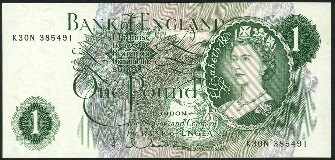 Bank of England, J Q Hollom, £1 (10), ND (1963), prefixes B93N,H26N,K30N,J72X,H82W,A83X,A17N,C32W,D96T,L05X, green, Elizabeth II at right, Britannia low centre right, also two replacement £1, prefix 22M and M08N