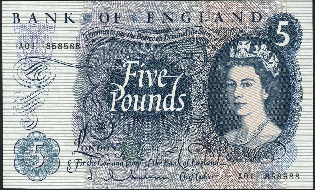 Bank of England, J Q Hollom, £5, ND (1963), serial number A01 858588, blue, portrait Queen Elizabeth II at right, bank title top centre left, value at low left, centre and top right, reverse, seated Britannia at centre