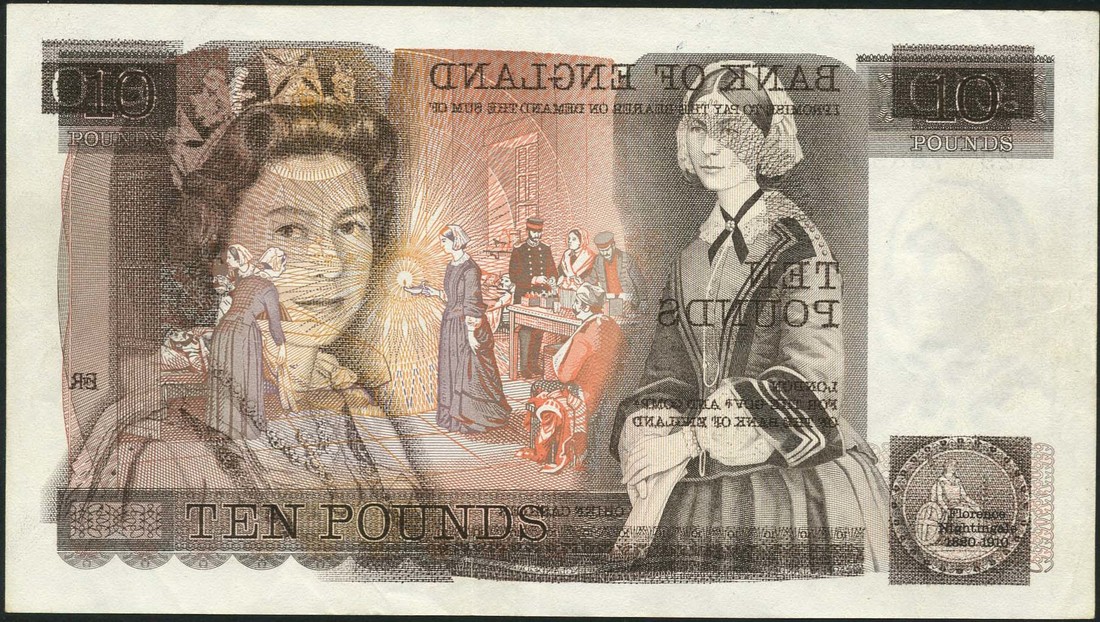 ERROR: Bank of England, G B Page, £10, ND (1984), serial number B29 788909, brown and multicoloured, Elizabeth II at right, Britannia low left, reverse Nightingale and Scutari, misprint of Elizabeth II at left