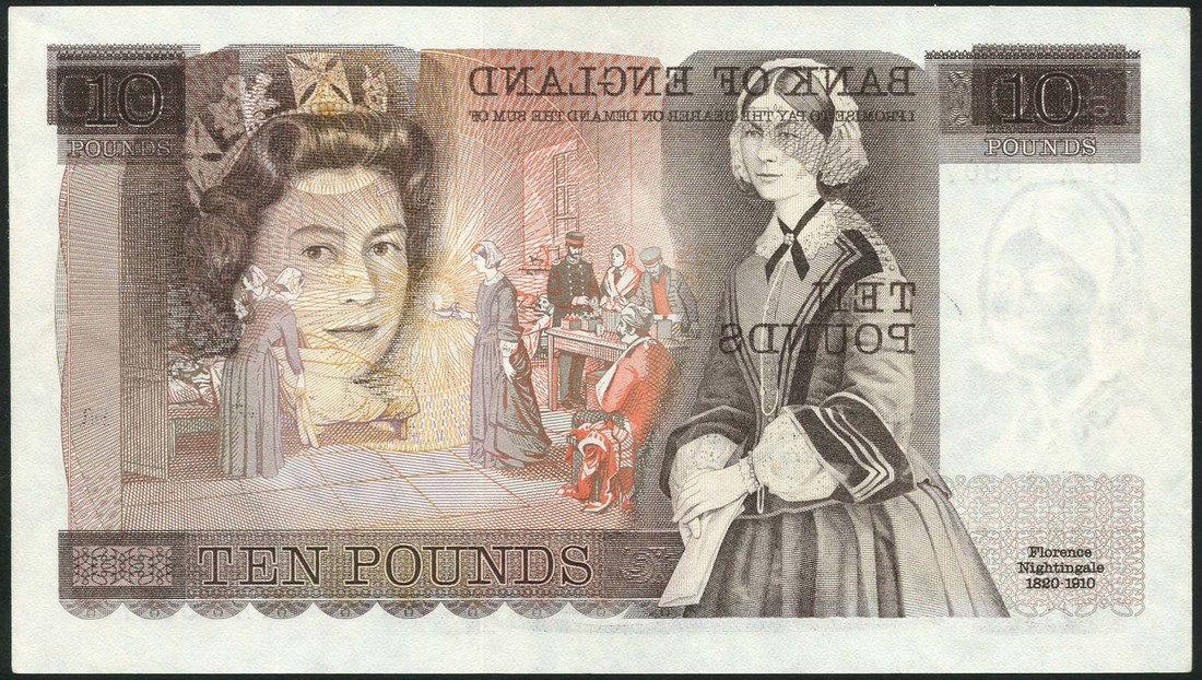 ERROR: Bank of England, D. H. F. Somerset, £10, ND (1984), serial number 61A 590736, brown and multicoloured, Elizabeth II at right, Britannia low left, reverse Nightingale and Scutari, mirror image of Elizabeth II at left