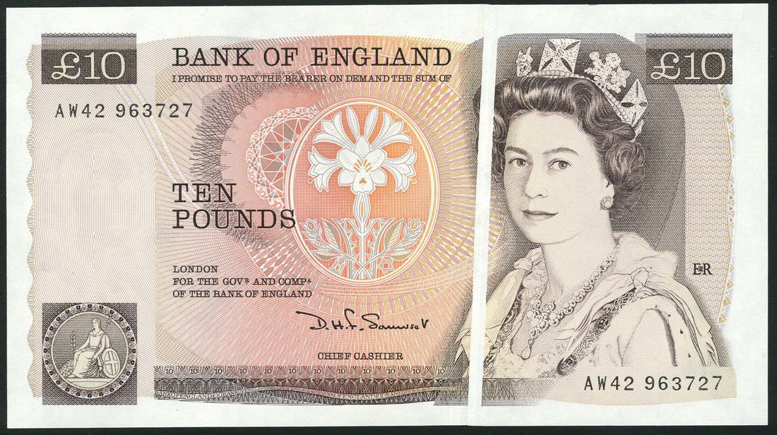 ERROR: Bank of England, D. H. F. Somerset, consecutive trio £10, ND (1984), serial numbers AW42 963725-7, brown and multicoloured, Elizabeth II at right, Britannia low left, reverse Nightingale and Scutari, all with gutter fold at centre right