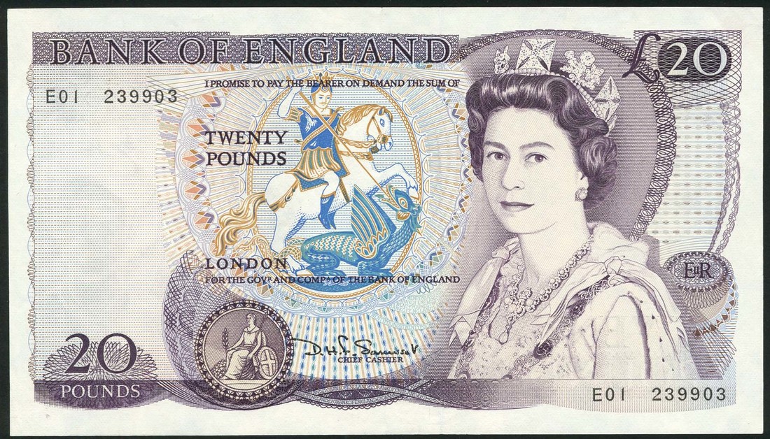 Bank of England, D H F Somerset, £20, ND (1981), serial number E01 239903, purple and multicolour, portrait Queen Elizabeth II at right, St George and dragon centre left with seated Britannia below, reverse, William Shakespeare