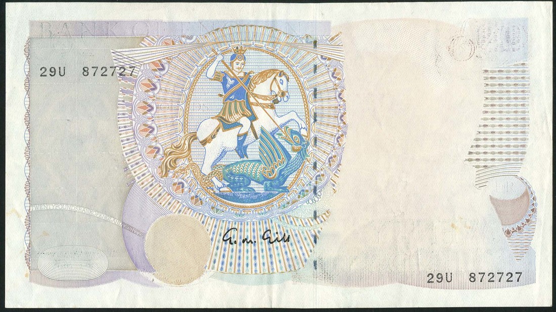 ERROR: Bank of England, G. M. Gill, £20, ND (1988), serial number 29 U 872727 purple and multicoloured, St George and dragon top centre, design missing Britannia low left, Queen Elizabeth and Bank title, reverse purple, William Shakespeare and the balcony scene from Romeo and Juliet