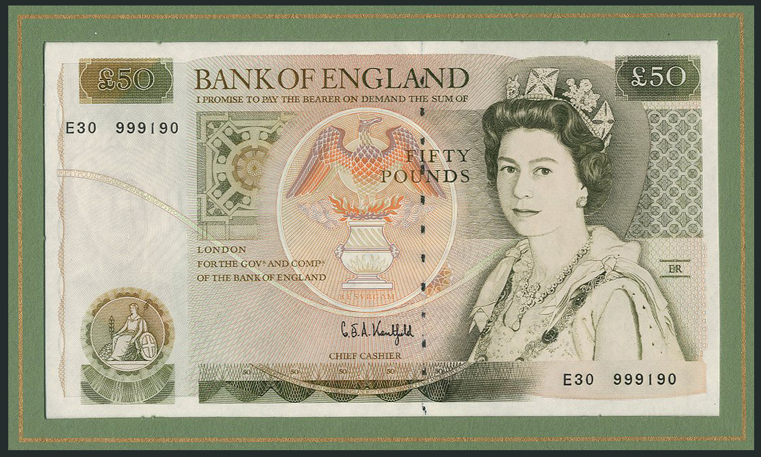 Debden Presentation Pack, green album containing £50, 1981, prefix E30, £50, 1994, prefix A01, with matching serial number 999190 and Kentfield signature