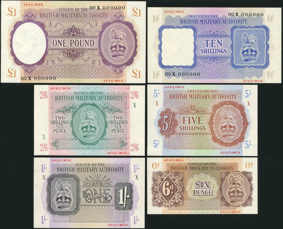 British Military Authority, specimen set ND (1943) comprising 6d, brown, 1 shilling, lilac, two shillings and sixpence, green and pink, 5 shillings, brown, blue and green, also 10 shillings, prefix 00X, blue and pink, £1, prefix 00X, violet, all with crowned lion in field