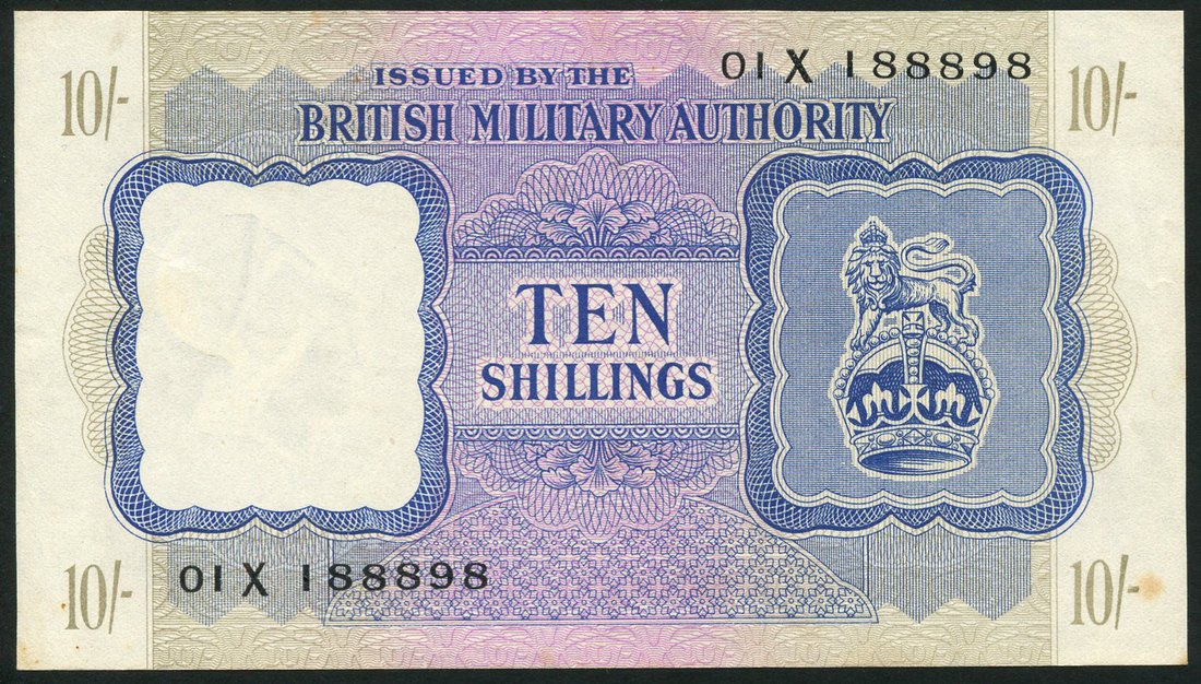 British Military Authority, 10 shillings, ND (1943), serial number 01X 188898, (Pick M5), about uncirculated, ex-Warburton,