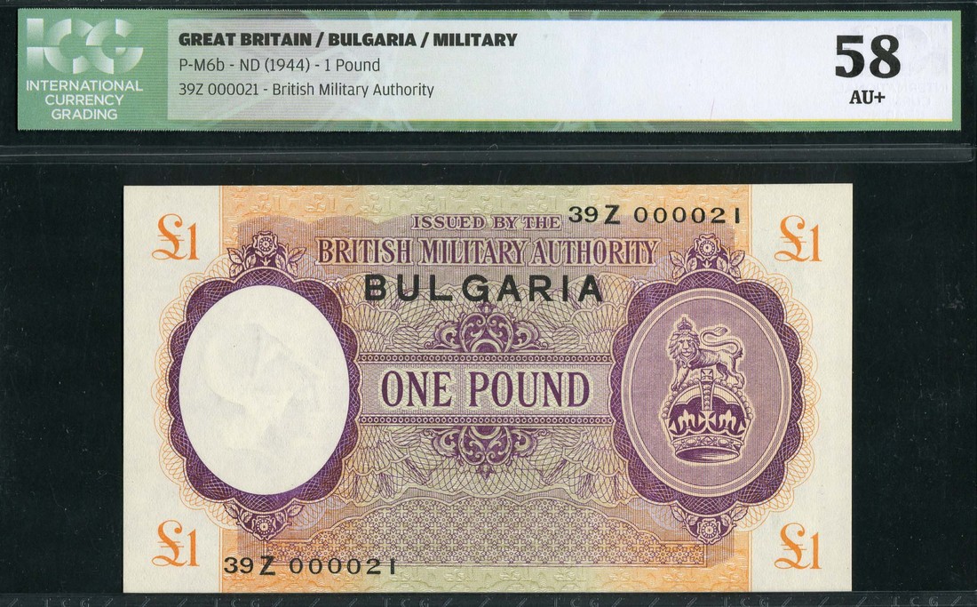 British Military Authority, £1, ND (1943-45), serial number 39Z 000021, BULGARIA overprint, purple, orange and green, lion and crown at right, black BULGARIA overprint at centre