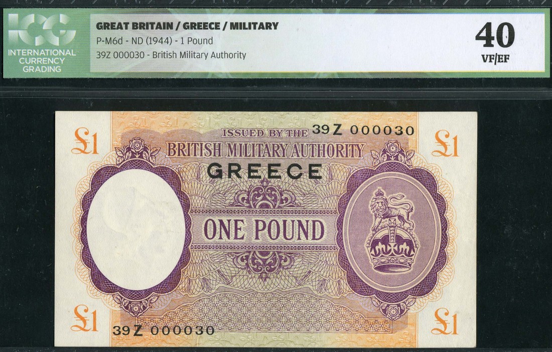 British Military Authority, £1, ND (1943-45), serial number 39Z 000030, GREECE overprint, purple, orange and green, lion and crown at right, black GREECE overprint at centre