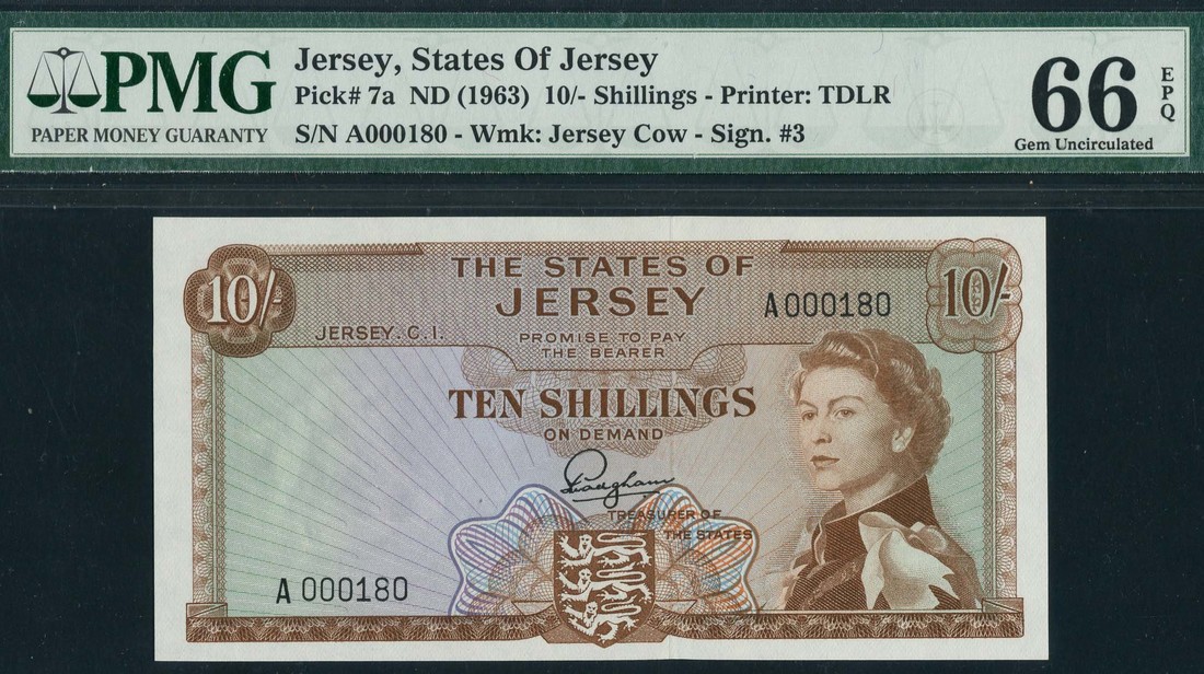 States of Jersey, 10 shillings, ND (1963), serial number A 000180, brown and pale blue, Elizabeth II at right, arms low centre, Padgham signature