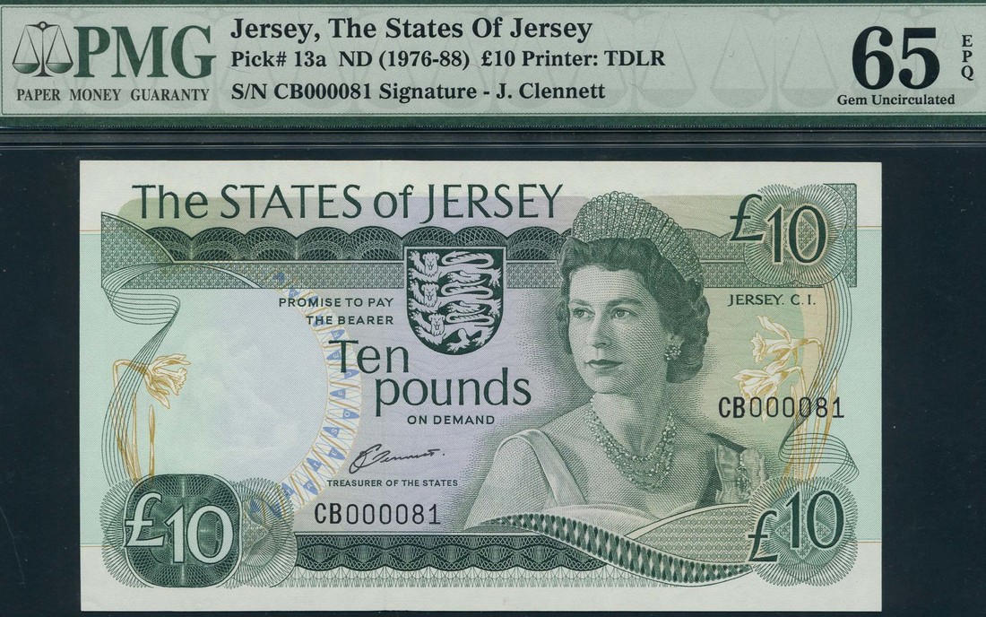 States of Jersey, £10, ND (1976-88), serial number CB000081, green, £20, ND (1976-88), serial number AB381386, reddish brown, both feature portrait Queen Elizabeth II at centre right, arms top centre, reverse, Victoria College and Gorey Castle respectively