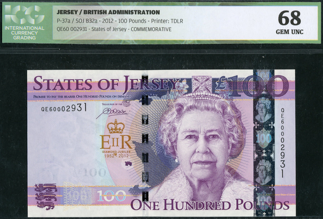 (x) States of Jersey, £100, June 2012, serial number QE0002931, purple on multicolour underprint, Elizabeth II at centre right, three lions at low left, value at right corners, reverse purple, Royal Mace of Jersey