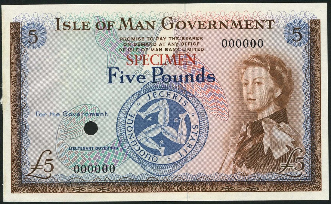 (x) Isle of Man Government, colour trial £5, ND (ca 1961), zero serial numbers, brown and blue, Elizabeth II at right, triskeles low centre, reverse brown, Castle Rushen