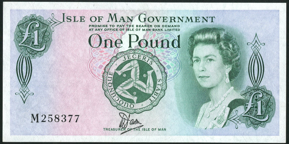 Isle of Man Government, a group of £1, ND (1983), serial numbers M070670, M258377, M297139, P391861, Dawson signature variety, green on multicolour, portrait of Queen Elizabeth II at right, triskeles at centre, reverse St. John's Church on Tynwald Hill,