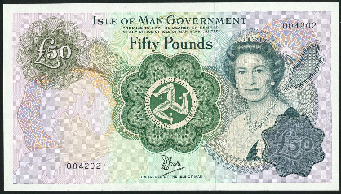 Isle of Man Government issue, £50, ND (1983), serial number 004202, green and multicoloured, triskeles at centre, Elizabeth II at right, Dawson signature