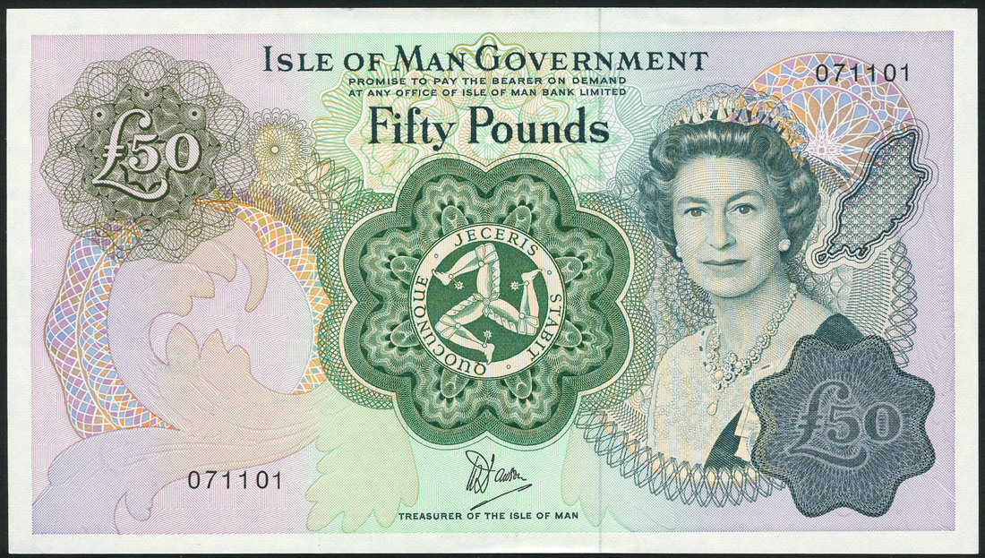 Isle of Man Government, a group of consecutive £50 (6), ND (1983), serial numbers 071101-6, green and multicoloured, silver jubilee portrait of Queen Elizabeth II by Peter Grugeon at right, triskeles at centre, reverse view of Douglas Bay, signature Dawson,