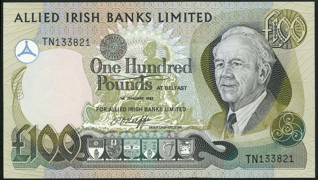 Allied Irish Banks Limited, £5, 1987, £10 (3), 1982,1988 (2), and £100, 1982, prefix TN, green,
